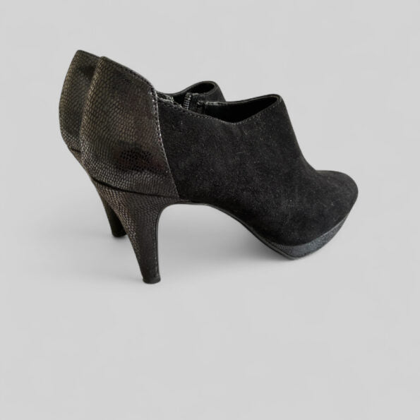 Discover the allure of these stylish ankle shoe from the trendy Bandolino Collection. They feature a chic silver closure on the sides and a unique blend of leather and suede materials.
