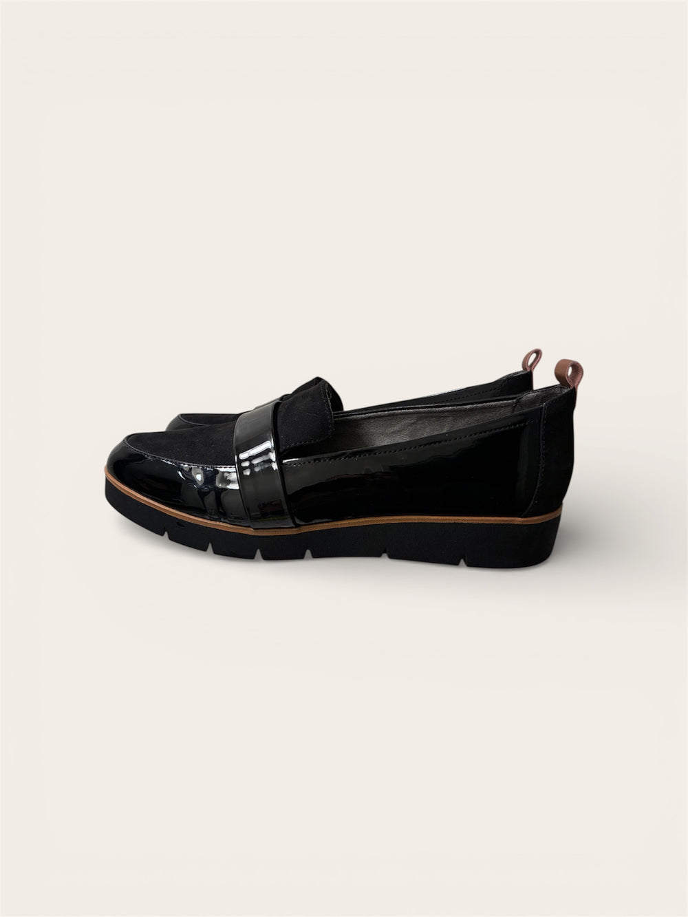 A trendy, edgy, and wonderfully comfortable loafer. Eco-friendly fabric toe box, linings, and topcloth made from recycled bottles, plus a heel counter constructed from recycled materials. Faux leather with soft, enjoyable linings. Slip-on style with a back pull tab for easy on and off. Insole Technology that offers anatomical cushioning, comfort, and arch support. Lightweight and flexible design that moves with you. Strap accent, almond toe, lug sole, and a 1-inch platform heel. This distinctive loafer with a tailored look is a must-have from work to weekend. Previously owned but in excellent shape!