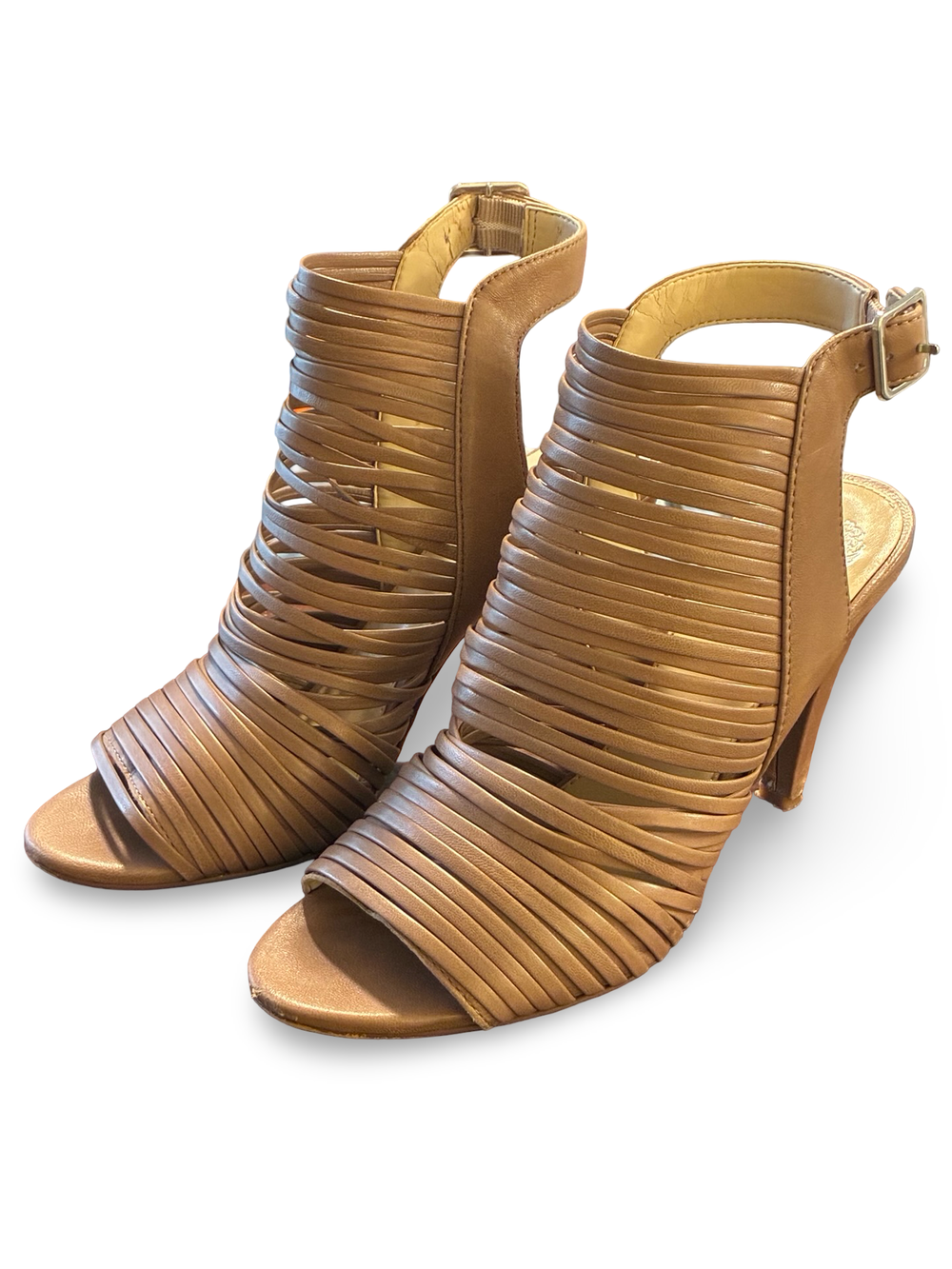 Sexy heels by designer Vince Camuto. Features a cute strappy style with a buckle attachment for closure. All leather upper. This is a preowned shoe in pretty good condition with some minor scratches on the heel. Review photos before purchase!
