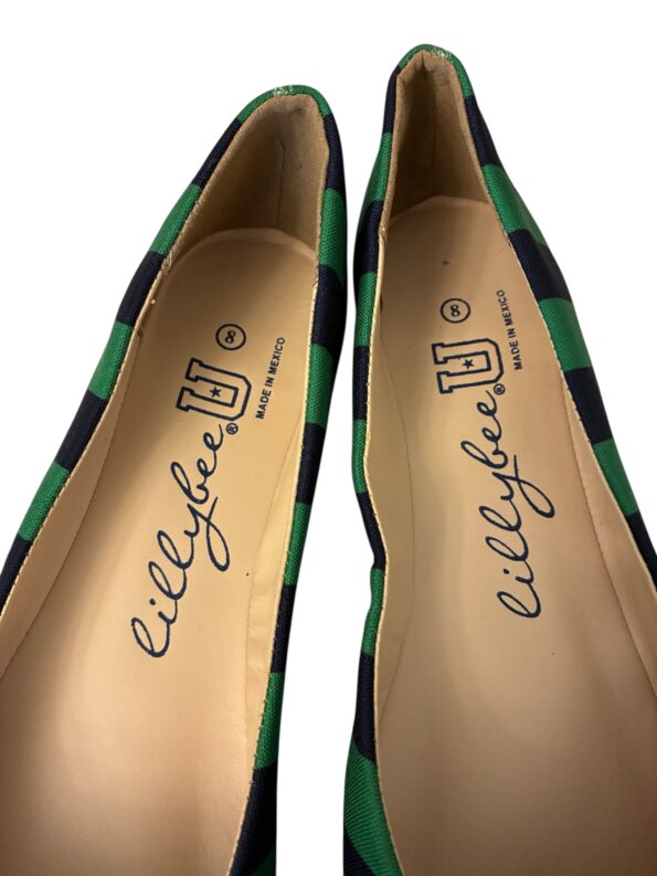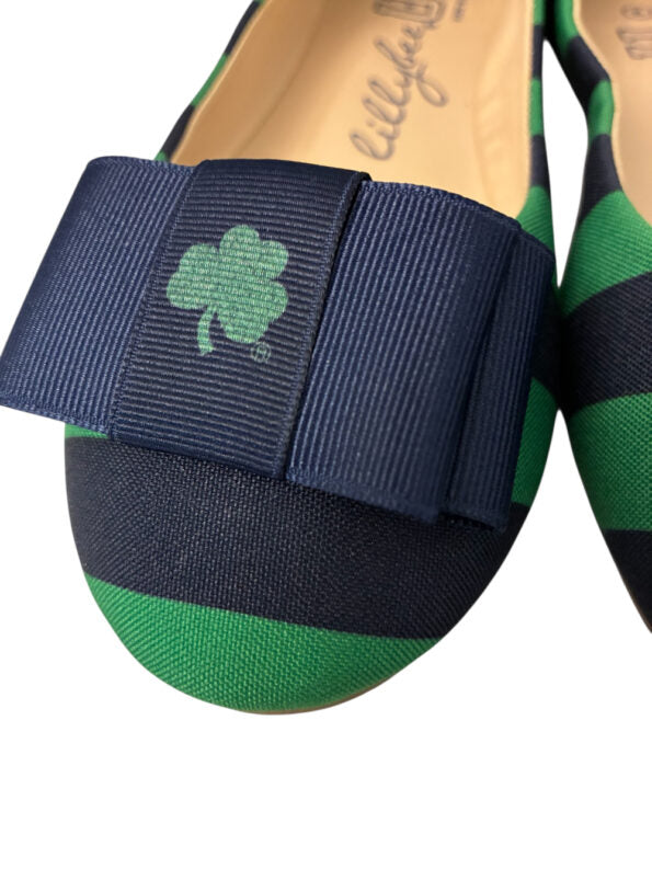 LillyBee U Collegiate Tennessee Women’s Ballet Flats are a stylish choice for any wardrobe. They feature a vibrant design with beautiful green and blue stripes, complemented by a charming bow at the front.