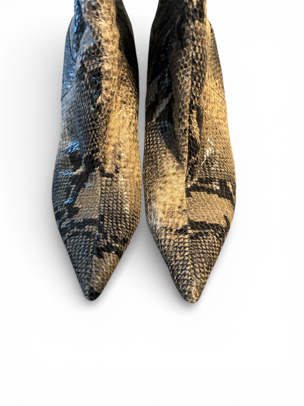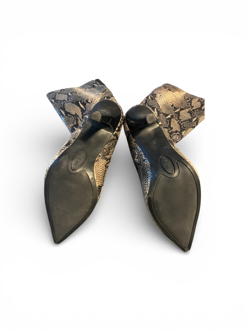 Discover these stylish boots from the renowned brand Nine West. They showcase a striking snake skin print that adds a unique flair to any outfit. With a mid-calf height and a pointed toe, these boots are both fashionable and versatile. The color palette features a blend of black, tan, and gold tones, making them easy to pair with various looks. Whether you’re dressing up for a night out or adding a chic touch to your everyday wear, these boots are a great choice. Although pre-owned, they are in excellent condition and look almost new. Don’t miss the chance to elevate your shoe collection with this eye-catching pair! Some silver marking on bottom soles but can easily be removed by cleaner or a simple finger nail.
