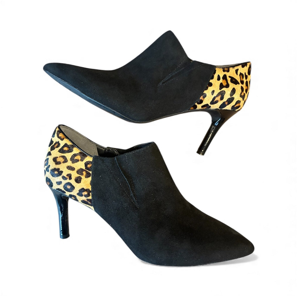 This trendy Rockport bootie highlights real calf hair at the back. We really like the leopard print it displays. It provides that extra special detail! Rockport shoes are recognized for their comfort and strength. These shoes merge style with Rockport's renowned comfortable stiletto heel. These charming booties are pre-owned and are in fantastic condition, showing just slight visible wear.