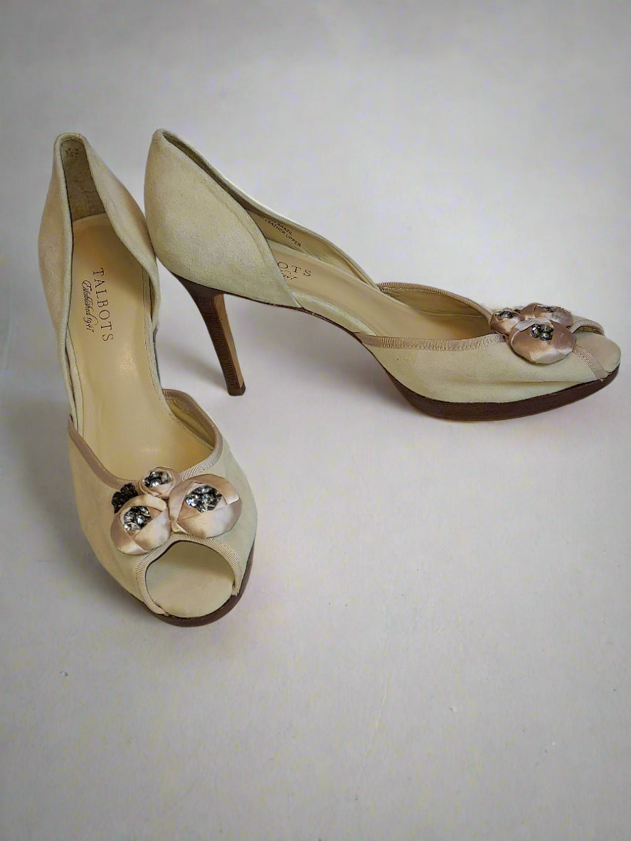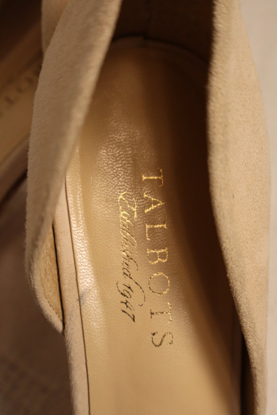 Explore the classic sophistication of Talbot's Suede High Heels - Size 9.5. Originally priced at $199, this exquisite shoe is now offered at a discounted rate. The elegant design showcases gemstone accents and a slip-on open toe style. While brand new, one shoe has a small black mark at the bottom. The color is a beautiful new mauve hue. Heel 4.5" inch heel.