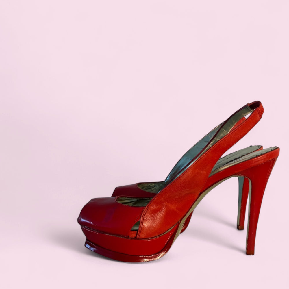 Create a striking impression with these gorgeous Bebe red patent leather stiletto heels! With an open toe design and a convenient slip-on style, they are perfect for adding a vibrant touch to any ensemble. Ideal for parties, romantic evenings, or special celebrations, these heels are a must-have. They are pre-owned but remain in good shape, featuring only a minor blemish on one shoe and somewhat worn soles. Please take a look at the photos for further details!