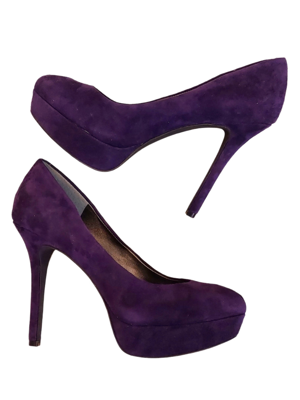 Crafted by renowned brand Jessica Simpson in a stunning purple suede design, these elegant shoes feature a peep toe and can effortlessly complete any wardrobe. In impeccable condition with minimal wear, they are a versatile addition to your footwear collection.