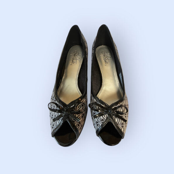 Uniquely crafted, this cozy shoe from the Life Strides brand is among the most adorable pairs we’ve encountered. This lovely piece won’t be available for long and showcases a distinctive pattern combining black and white hues. It also has adorable kitten heels. Additionally, a charming little bow at the peep toes adds a delightful touch. Although this shoe is pre-owned, it appears nearly brand new. There are no visible signs of wear, as the material and sole show no marks, rips, or damage. It is in excellent condition.
