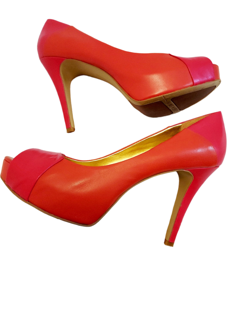 Discover the elegant and classy appeal of the Nine West Color Block Shoe - Size 7M. This eye-catching shoe showcases a combination of vibrant hot pink and orange tones, a seductive peep toe, and a 4.5 inch heel, providing effortless slip-on style and versatility for any chic ensemble. Crafted with a leather upper, this shoe is in impeccable condition with minimal signs of wear on the sole. Elevate your ensemble by teaming it with your go-to denim.